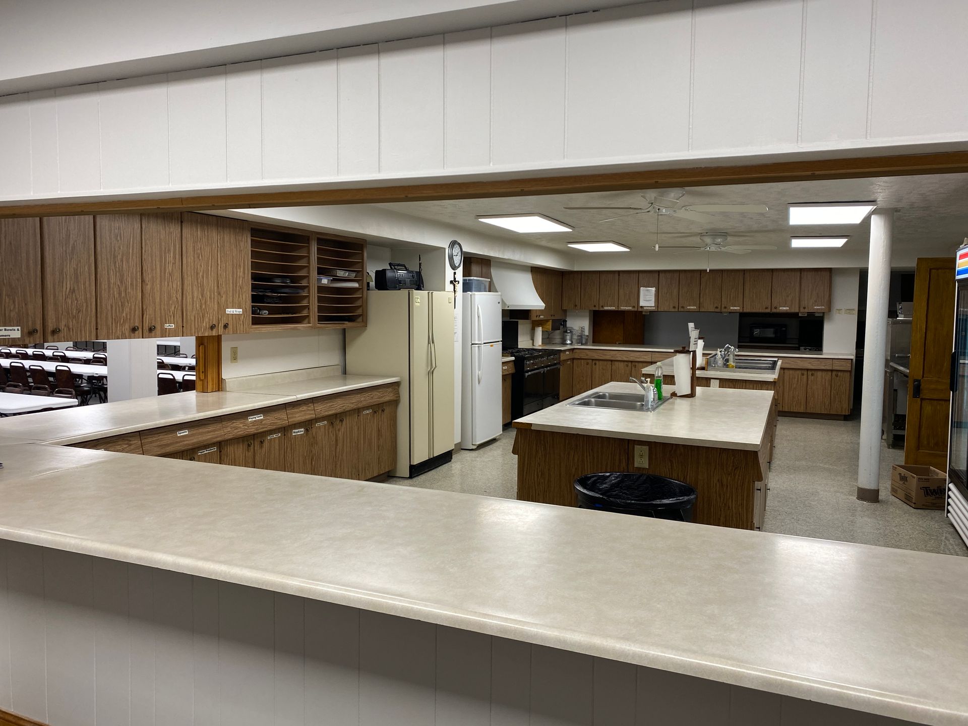 - Please remove trash and put new liners from under the coffeemaker in the trash cans. Remember to empty the two trash cans from the dining room. Put trash in our dumpster outside. The dumpster is located on the east side of the garage near the church.